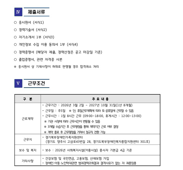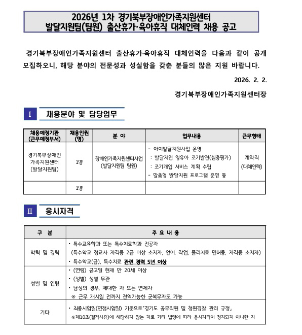 2026년 1차 경기북부장애인가족지원센터 발달지원팀(팀원) 출산휴가·육아휴직 대체인력 채용 공고
